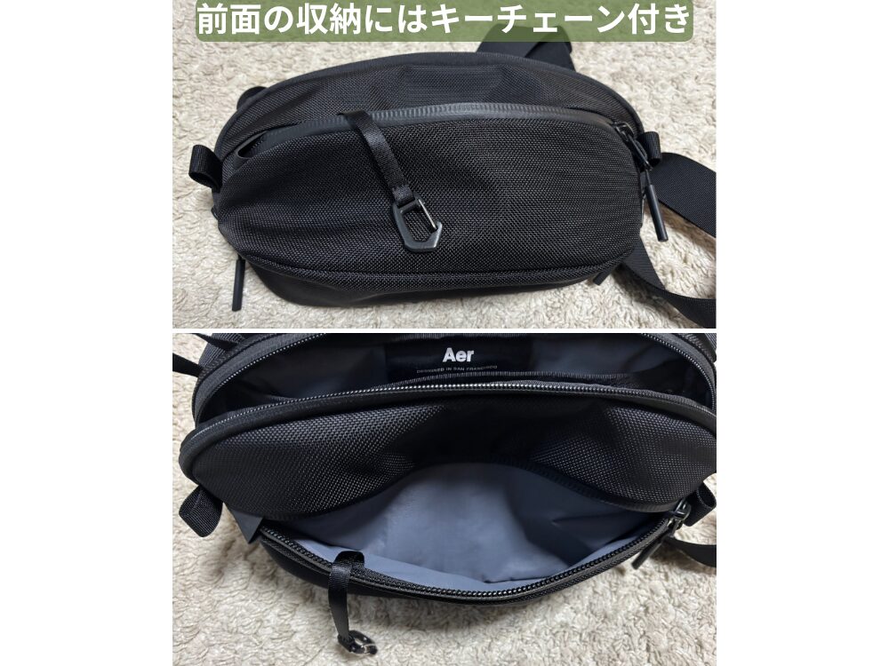 しかし、AerのDay Sling3のロゴも全く主張せず、どんな服装にも合わせやすいところが気に入っています。
