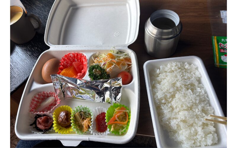 和食の朝ごはんには暖かい味噌汁が付きます。アルミホイルの中身は焼き鮭でした。