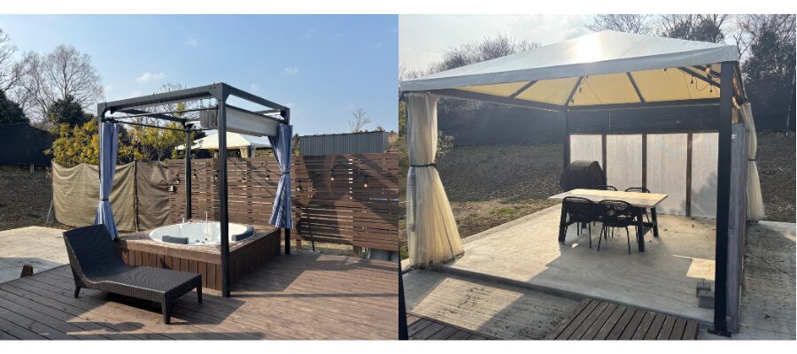 奥にはトイレ・シャワー室、露天ジャグジー、BBQスペース